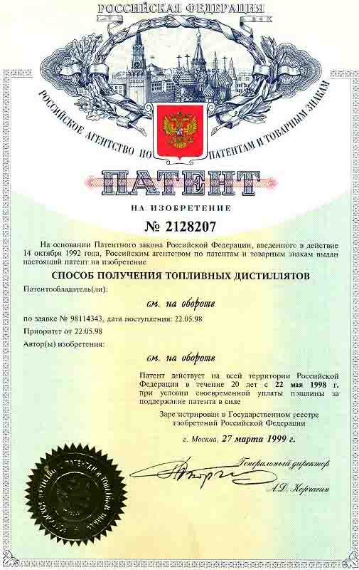 РФ - № 2009162, 1994г.; № 2009166, 1994г.; № 2128207, 1999г.; № 2182588, 2002г.; № 2198199, 2003г.; № 2261265, 2005г.; № 2297439, 2007г.